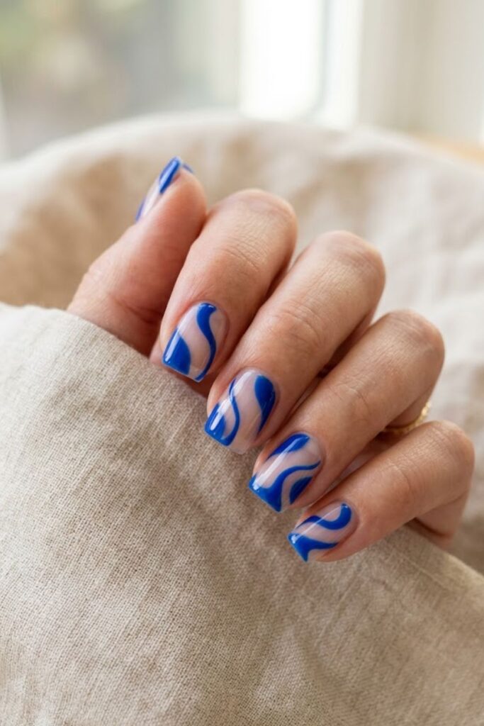 Keep it minimal with clear negative space sections paired with bold cobalt blue swirls. Using the acrylic as a strong base allows for these delicate painted details to really shine. It’s a creative, artistic set that proves short nails can still make a huge statement.