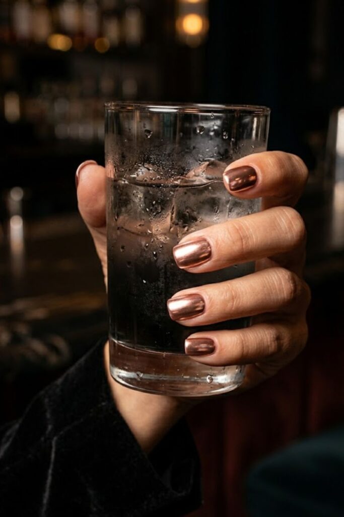A full-coverage rose gold metallic polish gives these short nails a jewelry-like feel. The reflective surface is sharp and crisp, proving you don’t need length to make a statement. This set is the definition of simple baddie energy for a night out with the girls.