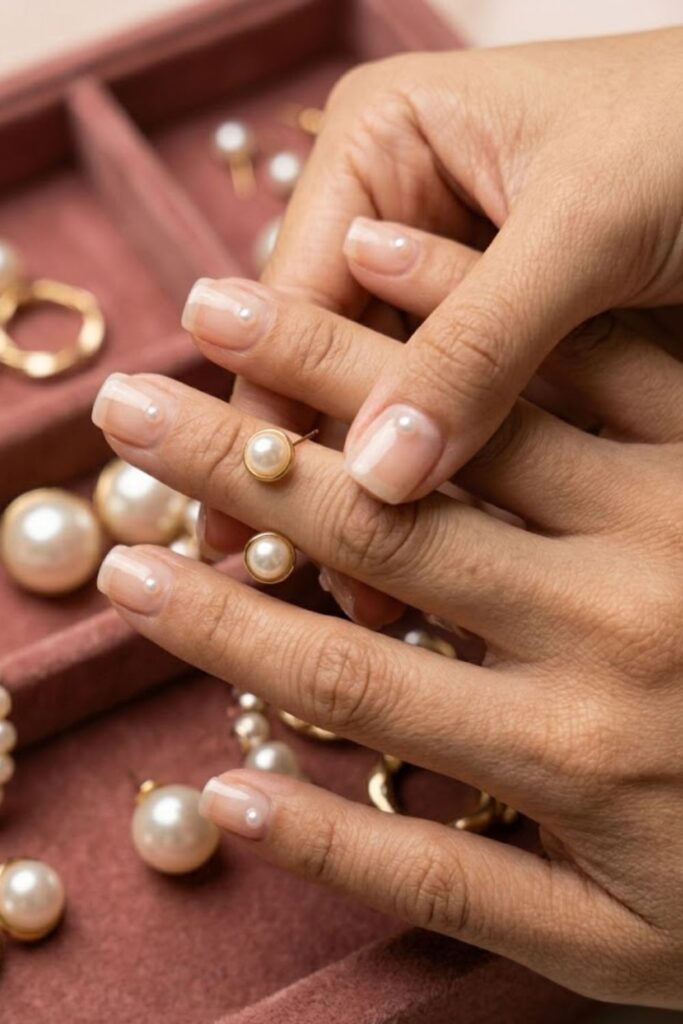 Small 3D pearl accents placed at the base of each nail over a clear coat look incredibly chic. This set leans into the coquette trend while staying very wearable for work or school. The vibe is delicate, sweet, and perfectly suited for a short square shape.