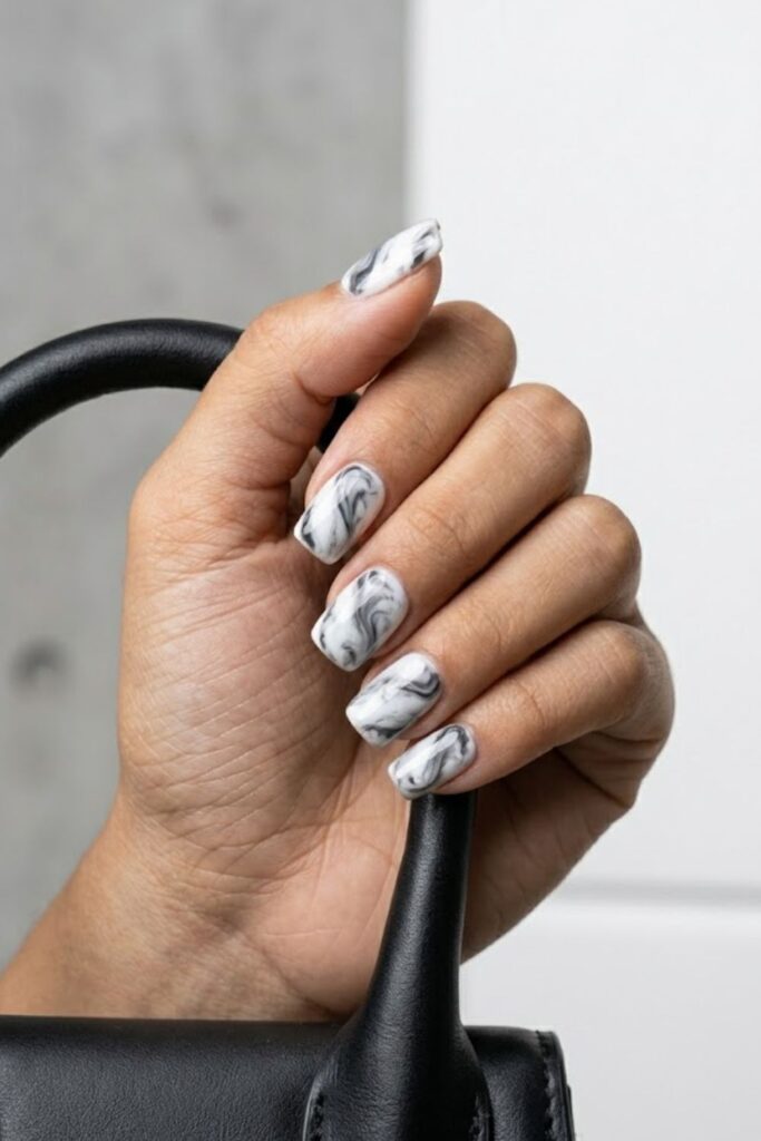 Soft wisps of charcoal grey marbleized into a white base create a stone-like texture that’s totally unique. Every nail is slightly different, giving you that mismatched mani feel without the bright colors. This set looks especially clean and sharp with a high-shine top coat.