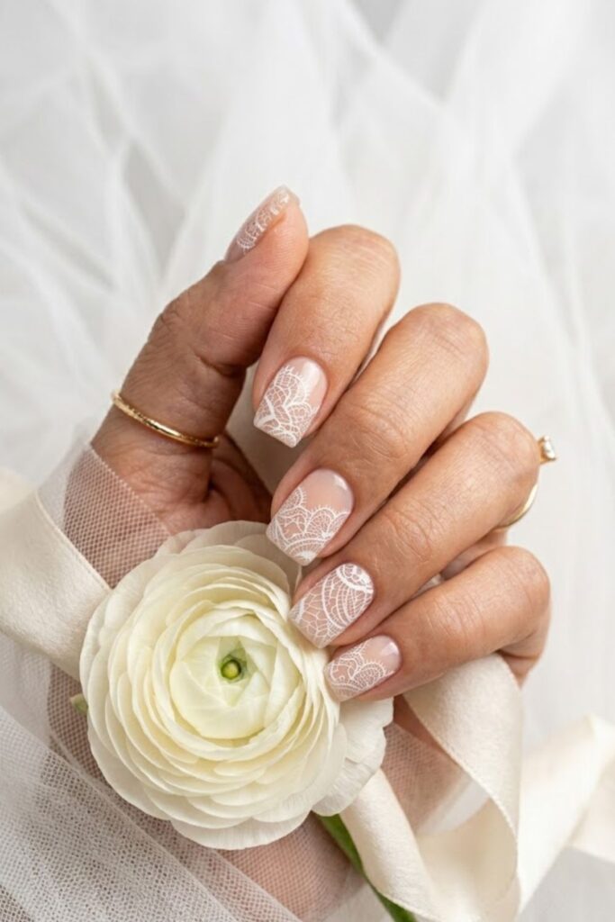 Delicate white lace patterns stamped over a sheer nude base give off major bridal vibes. The intricate lines are thin and crisp, making the design feel airy rather than cluttered. It’s a gorgeous way to add texture to a simple short square acrylic set.