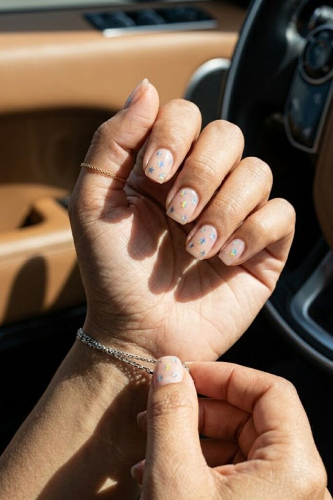 Tiny holographic star shapes are placed onto a naked nail for a playful, “your nails but better” result. The holo finish flashes rainbow colors whenever the sun hits your hands. Perfect for the girl who wants a little magic without a full-color commitment.