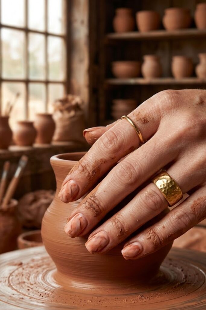 Blurs of terracotta and peach watercolor paint create a soft, earthy marble effect over a cream base. This set feels very Wilderkind and organic, perfect for matching with gold rings. It’s a creative way to wear warm tones without a solid block of color.