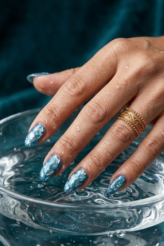 A textured shell-like finish is achieved by layering iridescent flakes under a thick gel top coat. The result is a shimmering, multi-dimensional look that reminds us of the ocean. It’s a simple, monochromatic set that still feels like a total conversation starter.