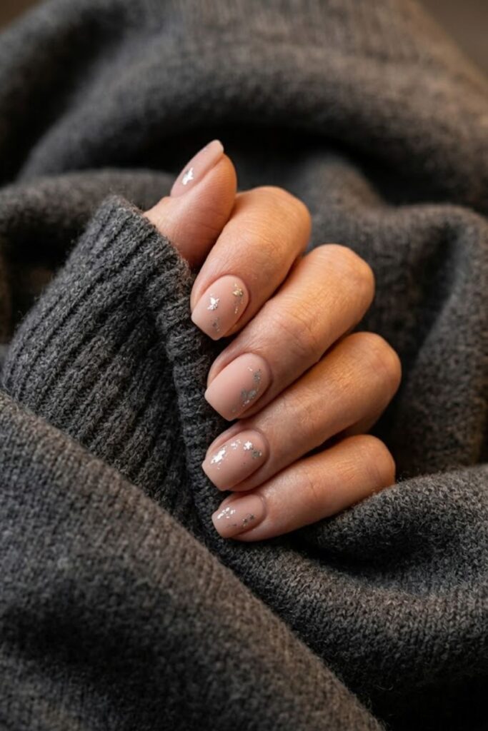 Matte nude nails get a cool upgrade with tiny flecks of silver foil placed randomly near the cuticles. This look is sharp and edgy without being too extra for everyday wear. Ask for a velvet top coat to make the metallic foil really stand out.