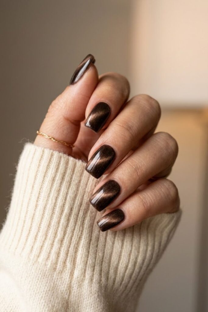 Rich coffee tones meet the magnetic velvet technique for a deep, shimmering finish that looks like fabric. The square shape keeps the dark color from feeling too heavy or overwhelming. Definitely a go-to set for those cozy, cool-weather months when you want something moody.