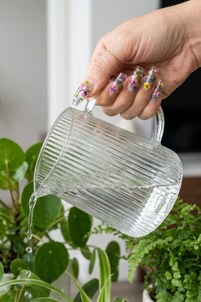 Tiny dried blossoms are encapsulated in clear acrylic for a botanical look that feels like a work of art. Keeping the flowers small and centered ensures the design stays within the “simple” brief. This mani is perfect for anyone obsessed with the Wilderkind nature aesthetic.