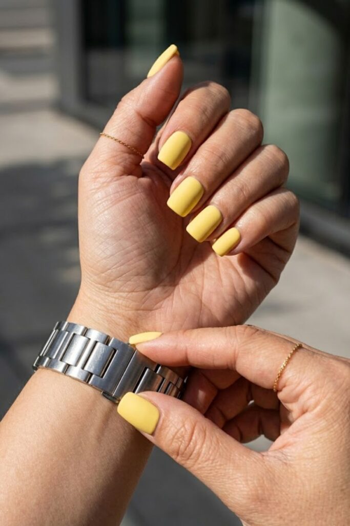 Soft pastel yellow in a flat matte finish is such a vibe for a cheerful, sunny set. Removing the shine makes the color look modern and less like a traditional candy shade. It’s a clean, bold choice that looks especially fire on shorter square lengths.