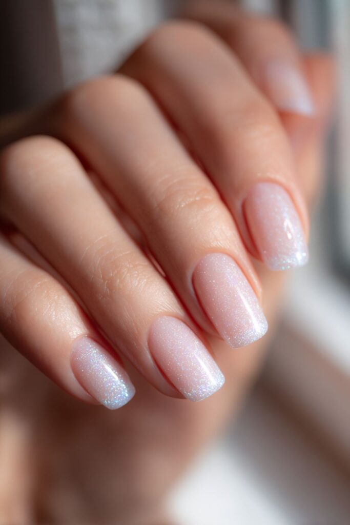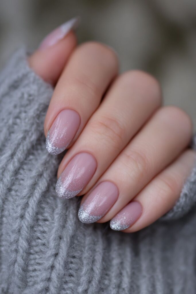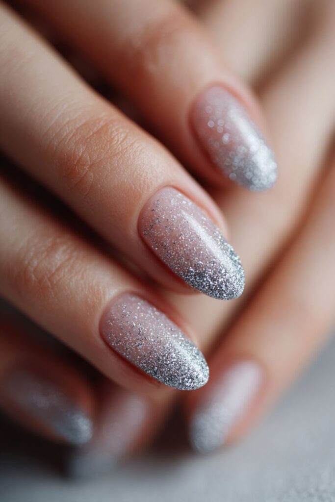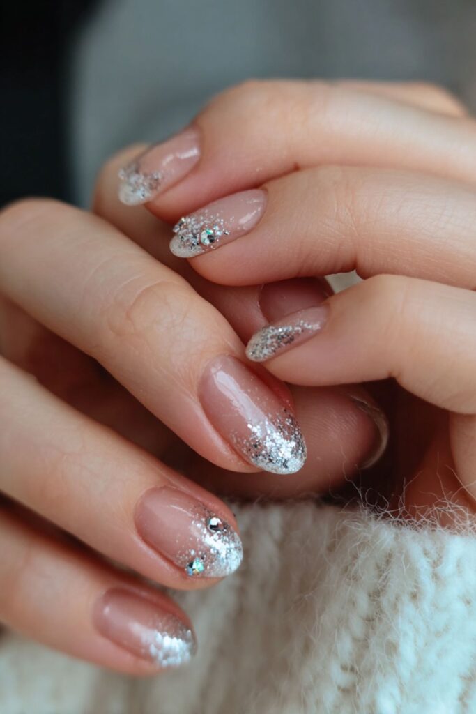 A soft airbrush spray of silver glitter creates a hazy, diffused French tip look. This technique avoids harsh lines for a soft-focus sparkle that looks incredibly clean. It’s a dreamy set that works for daily wear or special events.