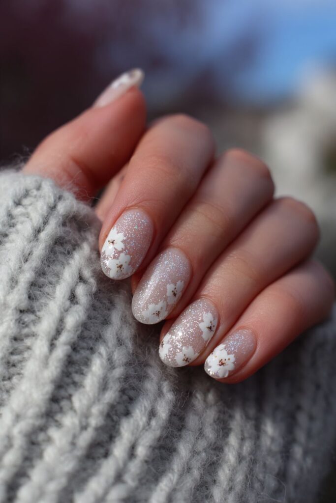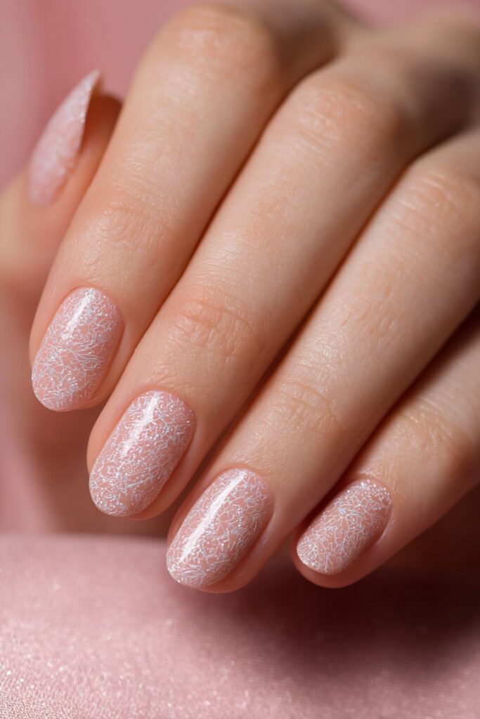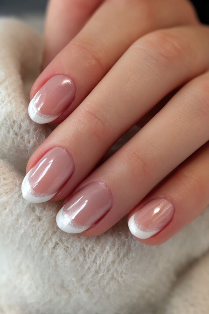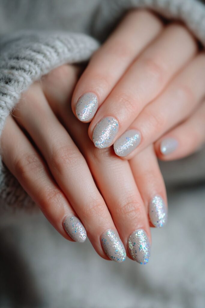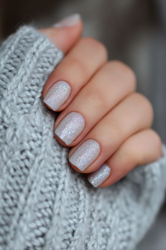 A soft airbrush spray of silver glitter creates a hazy, diffused French tip look. This technique avoids harsh lines for a soft-focus sparkle that looks incredibly clean. It’s a dreamy set that works for daily wear or special events.