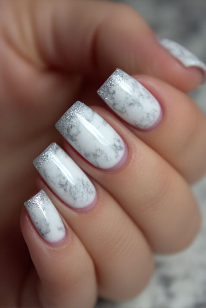 Your nail tech swirls silver glitter into white gel to create a stone-like marble effect on each tip. No two nails look exactly the same, giving you a custom mismatched mani feel. The vibe is expensive and sharp, especially with a high-gloss top coat.