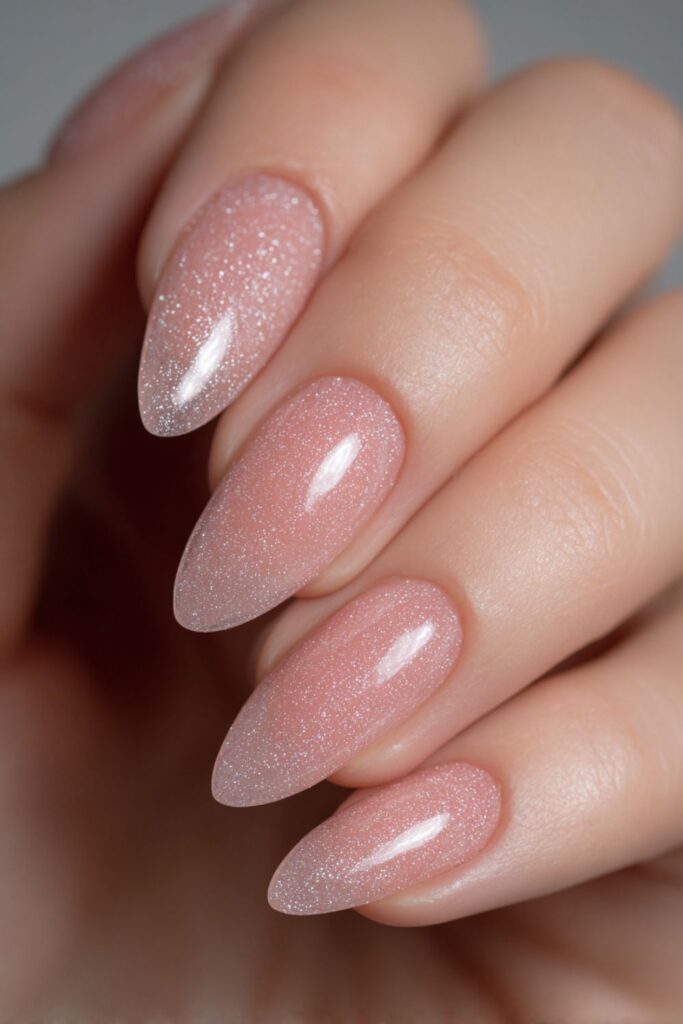 Your nail tech uses a magnetic gel to pull the sparkle into a soft, velvety texture on the tips. This technique gives the almond shape a dreamy, moving glow that regular glitter just can’t match. It’s giving quiet luxury but with a fun, sparkly twist.