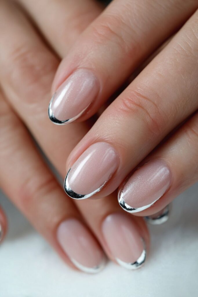 Neo Deco vibes are huge right now, and this metallic look delivers. Think a classic French tip but with a thin silver chrome line tracing the smile line. It’s a crisp, modern take on a traditional mani that feels totally fresh for 2026.