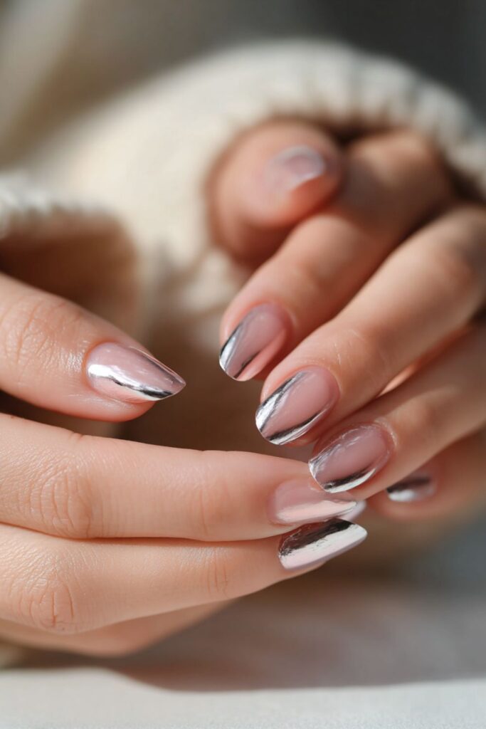 Instead of a standard tip, this set features a diagonal mirror silver sweep across one side of the nail. The negative space keeps it feeling modern and architectural. Definitely a set for someone who wants a unique spin on the silver glitter trend.