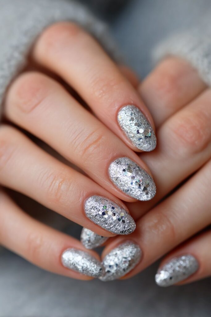 This set features heavy silver flakes trapped under clear acrylic for a deep, 3D effect. The vibe is icy and bold, perfect for anyone who loves a high-shine finish that catches every light. Ask for a nude base to keep the focus on the glitter.