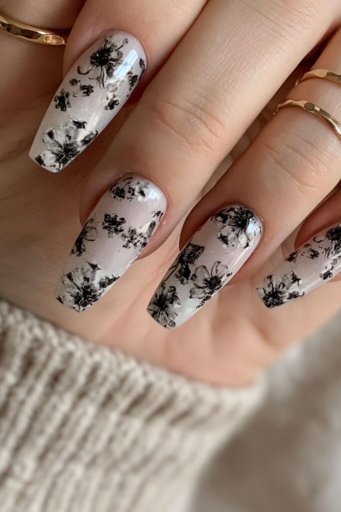 Real dried black flowers are encapsulated in clear acrylic for a dark, romantic Wilderkind vibe. The botanical details look stunning against a milky white background. Such a unique choice if you love floral nail art but want to flip it for the darker months.