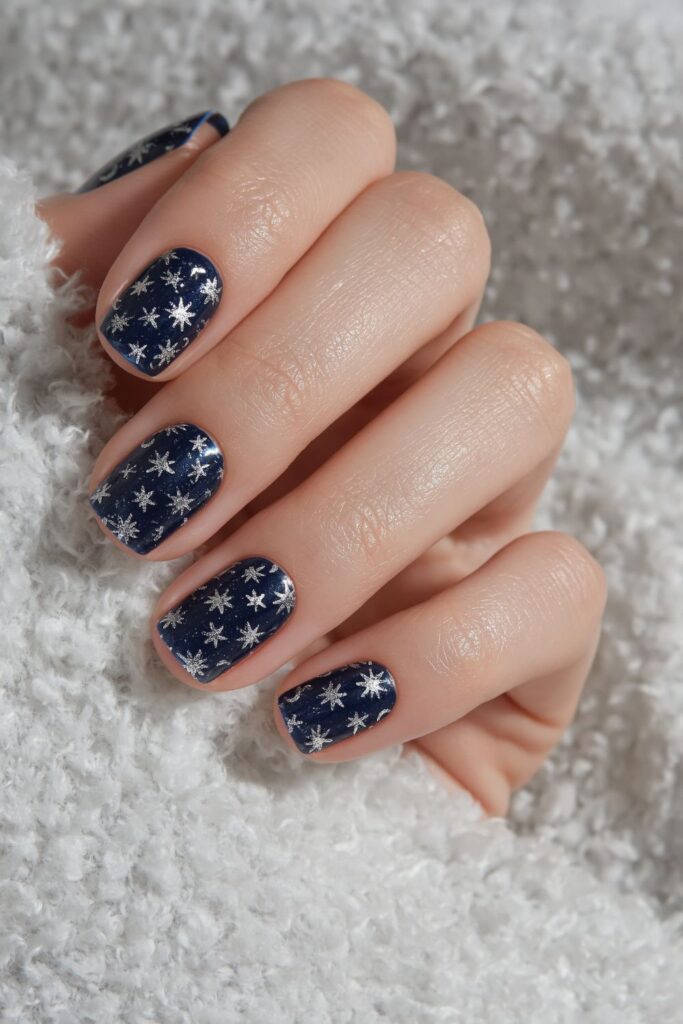 Moody navy blue nails get a celestial upgrade with silver stamped stars and tiny crescent moons. The look is more “witchy aesthetic” than “costume party,” which feels very Wilderkind and earthy. Ask for a glossy top coat to make those metallic stamps really shine against the dark base.