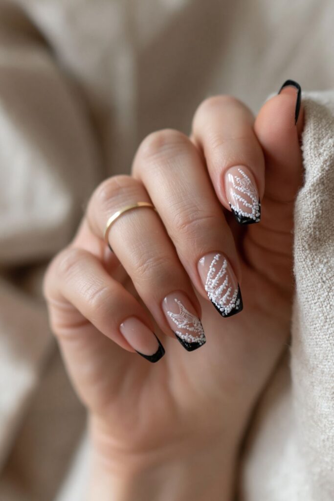 Tiny white pearl accents are used to build a 3D skeleton ribcage over a sheer nude base. Paired with a black micro-French tip, the vibe is dainty yet creepy. This set is perfect for a clean girl aesthetic that still wants to participate in the October nail art hype.