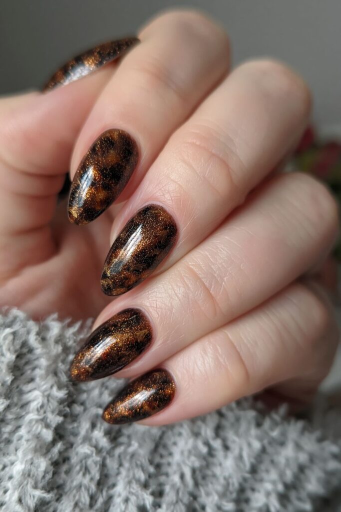 Warm brown tortoiseshell patterns get a spooky twist with a gold magnetic cat-eye layer underneath. The shimmer adds a hidden dimension that only appears when you move your hands. Such a rich, autumnal look that feels expensive and perfectly fits the 2026 earthy nature trends.