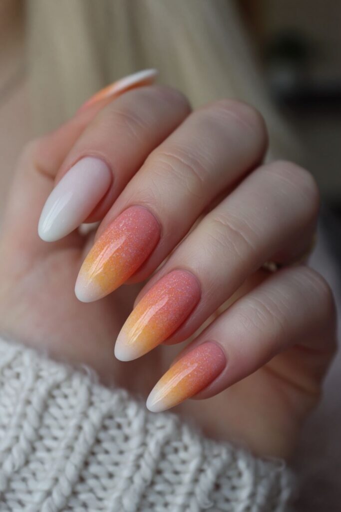 Soft white melts into orange and yellow for a diffused, modern take on the classic Halloween candy. The airbrush ombré technique makes the transition look seamless and hazy rather than literal. Such a dreamy way to wear bright colors without looking like a literal piece of food.