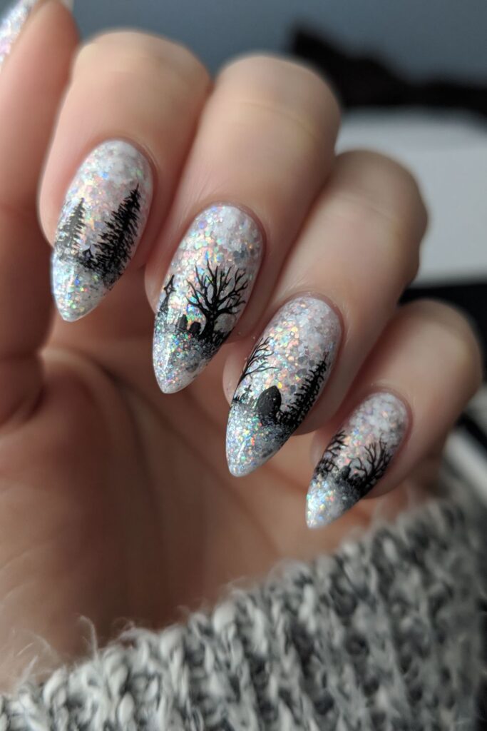 Holographic glitter provides a disco-ball background for pitch-black hand-painted graveyard silhouettes. The rainbow flash makes the spooky trees and headstones look like they’re sitting under a full moon. This set is high-contrast and looks absolutely fire under club lights or at a party.