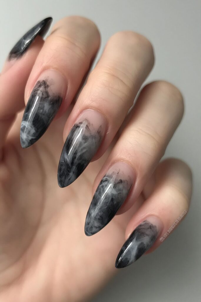 Wispy grey marble swirls create a smoke effect that drifts across a sheer black aura base. The look is ethereal and mysterious, giving off major “haunted mansion” energy. Your nail tech uses a blooming gel to let the colors bleed naturally for a soft, smoky finish.