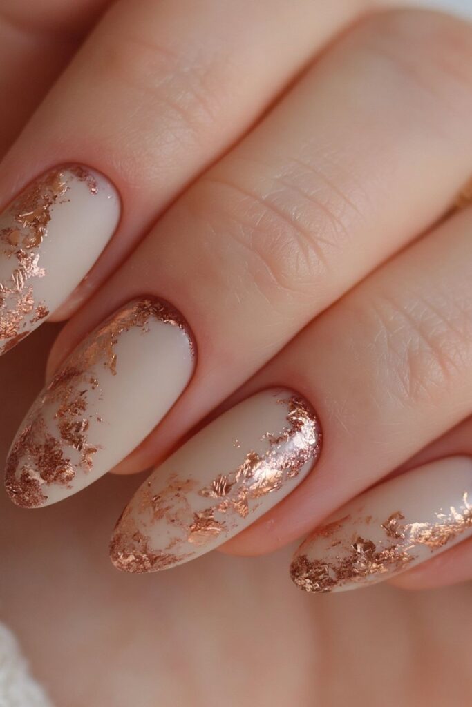 Matte nude nails get a “Frankenstein” upgrade with jagged copper metallic foil stitches across the tips. The mix of textures is super cool and feels more industrial than a standard drawing. Perfect for the girl who wants a baddie set that feels edgy and a little bit punk.