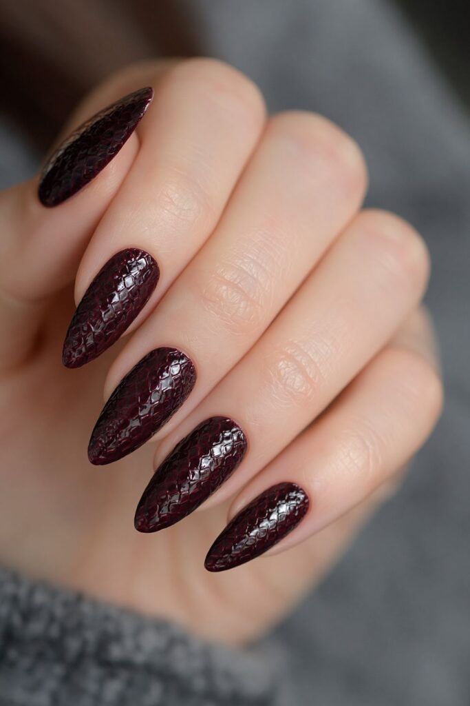 Deep burgundy croc print creates a textured, “mob wife” look that feels dangerous and chic. The 3D animal print is achieved using a thick top coat over a dark base. These nails are bold, dramatic, and scream luxury while staying firmly in the Halloween color palette.