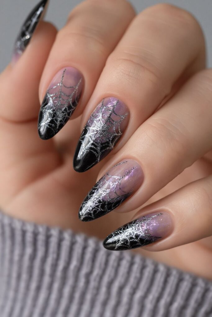 For the girl who keeps it trendy, this set blends a hazy purple aura center with silver chrome spiderwebs. The metallic finish catches every light, making these nails look expensive and sharp. Ask for a black base to make that center pop for your next October acrylic set.