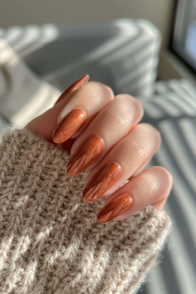 Think glazed donut but in a burnt orange duo-chrome that shifts from copper to gold. The mirror finish makes a simple pumpkin color feel way more sophisticated and trendy for 2026. Great for the girl who wants Halloween vibes that still work with her everyday neutral outfits.