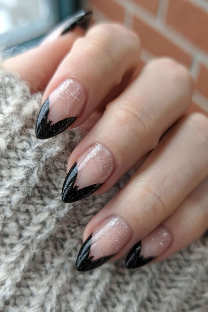 Clean and minimal, this set uses negative space to create the silhouette of bat wings against a natural nail bed. Black tips are reshaped into sharp points to finish the look. It’s a low-maintenance way to do spooky season while keeping your regrowth looking tidy and intentional.