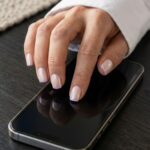 Cool blue lines curve across a bare nail to create a geometric, Neo Deco inspired set. Leaving parts of the nail natural makes the growth less obvious and keeps the vibe light. It’s a creative way to wear color while staying minimal.