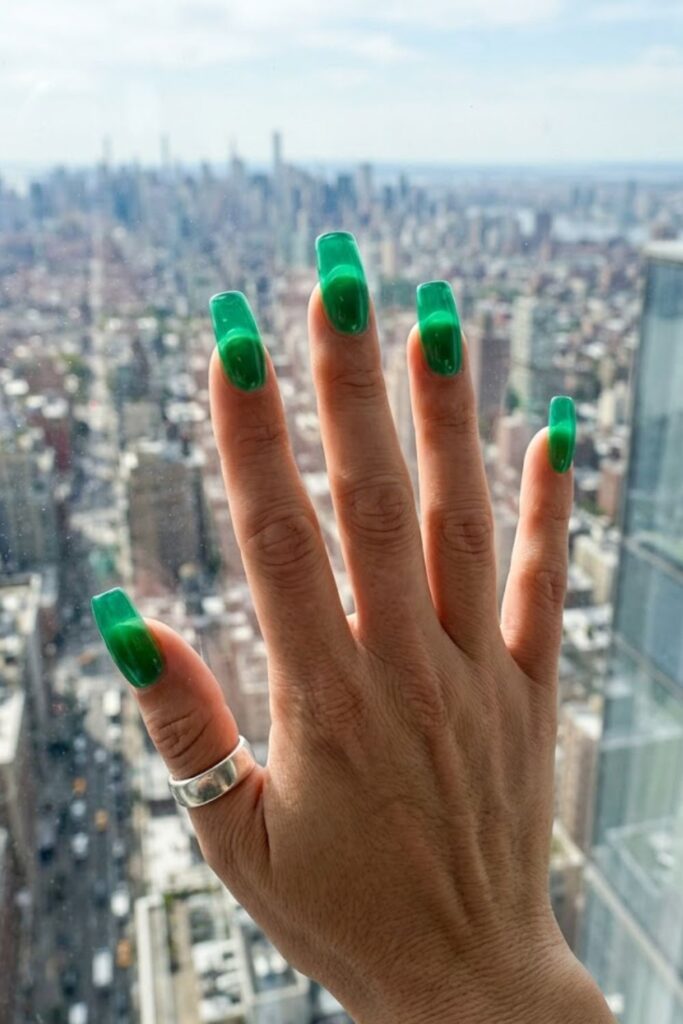 Translucent emerald green looks like sea glass on a long square acrylic set. The jelly finish allows light to pass through the tip, making the length look intentional and glassy. It’s a bold color choice that still feels “clean” because of the finish.
