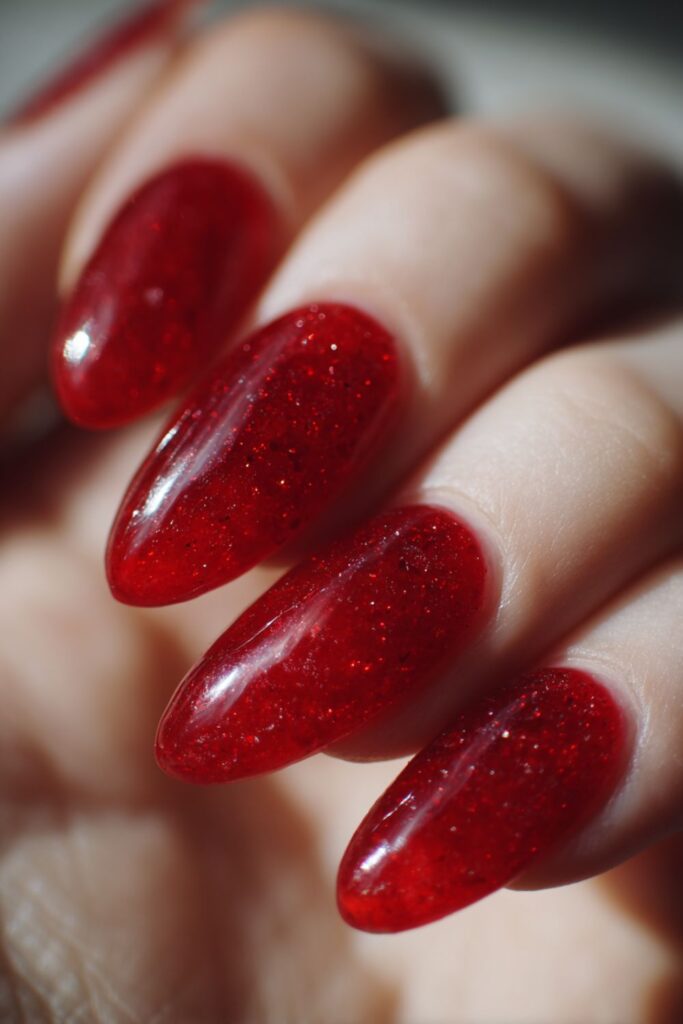 These translucent nails give major jelly candy aesthetic vibes for the summer. The red is see-through like sea glass but stays vibrant and playful on your almond acrylics. Obsessed with how squishy and fun this look feels for a festival or vacation.