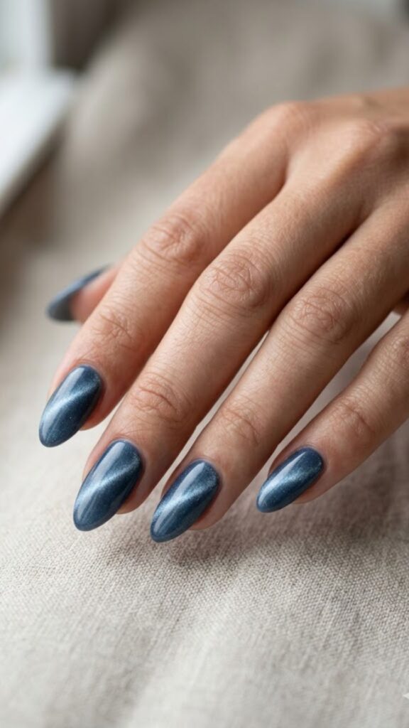 Your nail tech uses a magnetic gel to pull a velvet-like shimmer across the nail. This icy blue shade feels fresh and cool, giving off a major 2026 energy. It’s a statement set that still feels grounded and very clean.