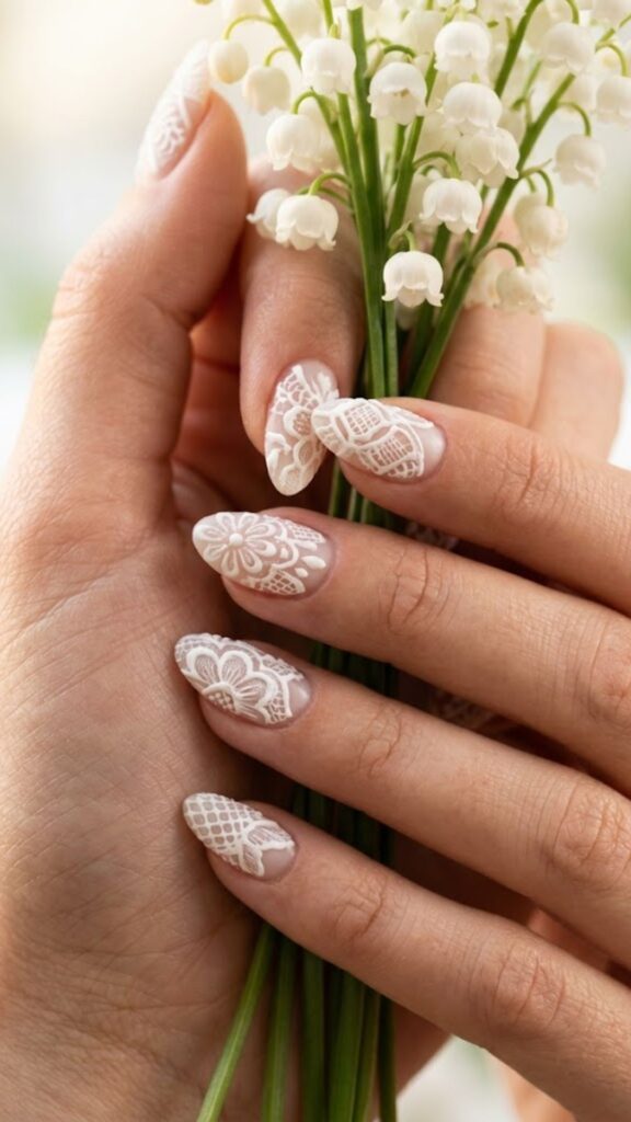 Delicate lace stamping or hand-painted details create a coquette aesthetic that’s so trendy right now. This look is incredibly detailed but stays classy because of the monochrome white palette. Ideal for a bridal moment or just feeling extra feminine.