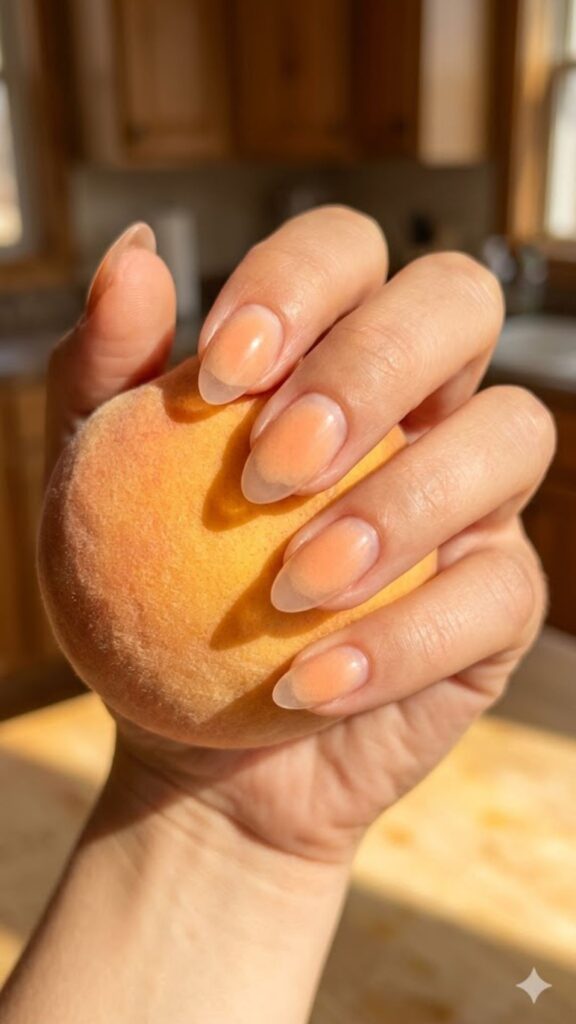 Airbrush techniques create a soft glow in the center of each nail for a dreamy aura effect. Using a soft peach tone keeps it subtle rather than loud. It’s a modern way to do a gradient that feels fresh and youthful.
