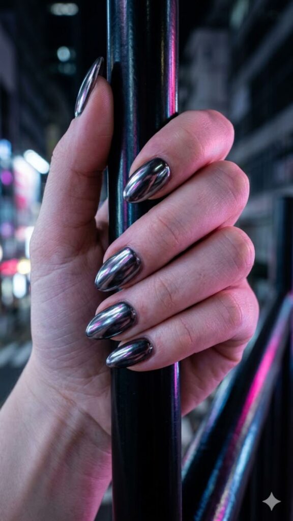 For a slightly edgy take on classy, try a dark charcoal with a mirror chrome finish. The reflection is so sharp it almost looks like liquid metal on your fingertips. This set is perfect for a night out when you want something bold.