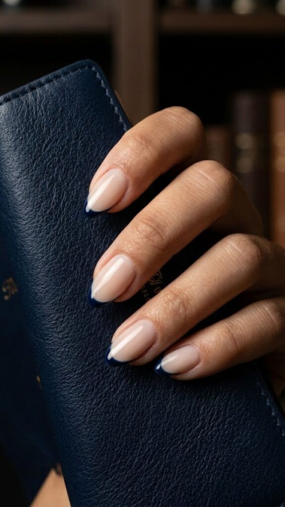 Swap the white for a deep navy blue to give your French tip a moody update. The line stays ultra-thin to keep the look sharp and sophisticated. Definitely the move if you want a dark color without committing to a full solid set.