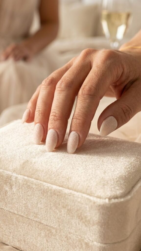Matte meets metallic here with a soft velvet finish that catches the light. This technique creates a fuzzy, touchable texture that looks incredibly expensive in a soft nude or pearl shade. Definitely a top-tier choice for a wedding or a big event.