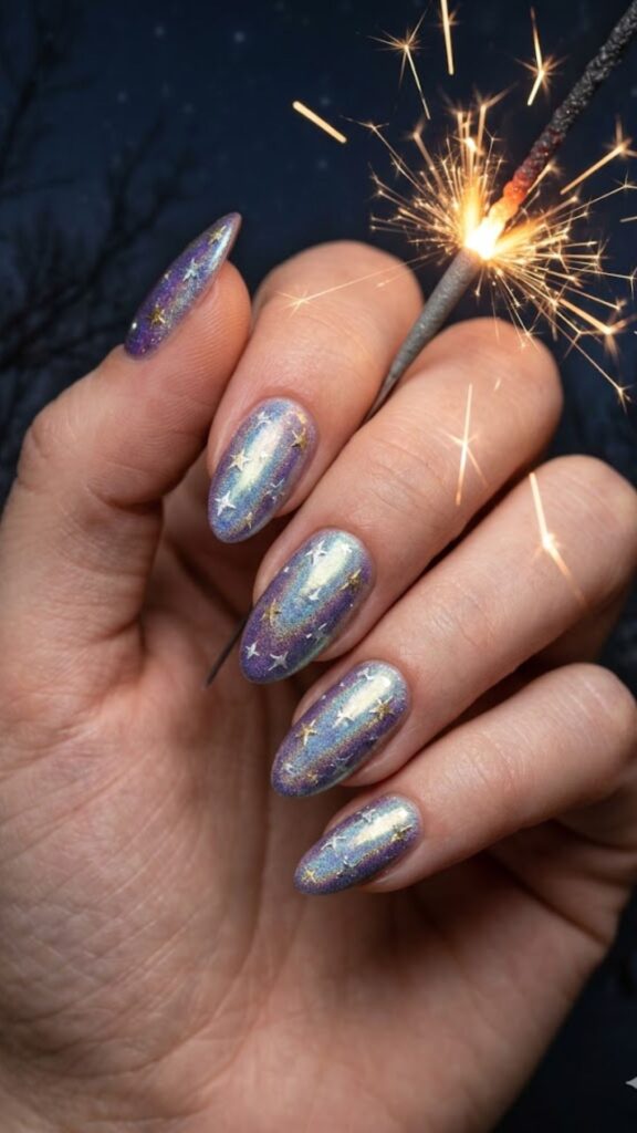 Tiny hand-painted stars over a holographic base make this set feel like a clear winter night. The shifting colors in the holo gel give off serious northern lights energy. Such a fun, playful way to add some sparkle to a short acrylic set.