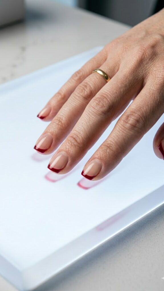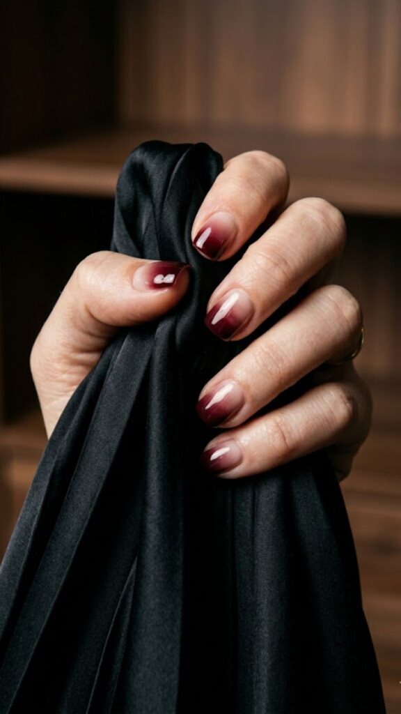 Rich burgundy melts into a nude base for a moody, seamless transition. Such a fire choice for anyone who wants a subtle grow-out without losing the drama. The square shape keeps the fade looking sharp and modern.