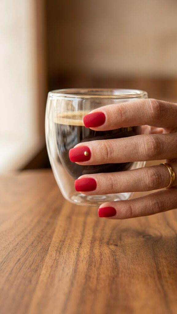 Matte meets metallic here if you add a tiny gold stud at the base. Using a flat top coat on bright red creates a soft, suede-like texture that feels very 2026. Perfect for a sharp, professional mani.