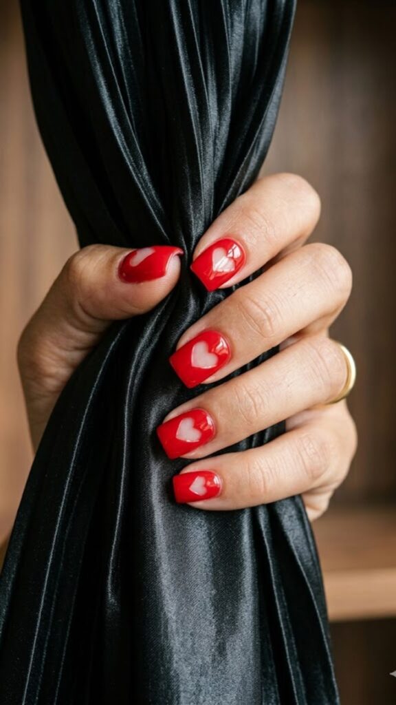 Clear sections meet bright red polish for a fun, cut-out feel. This set features tiny hearts or geometric lines that let your natural nail peek through. It’s a fresh take on classic red nail art that feels young.